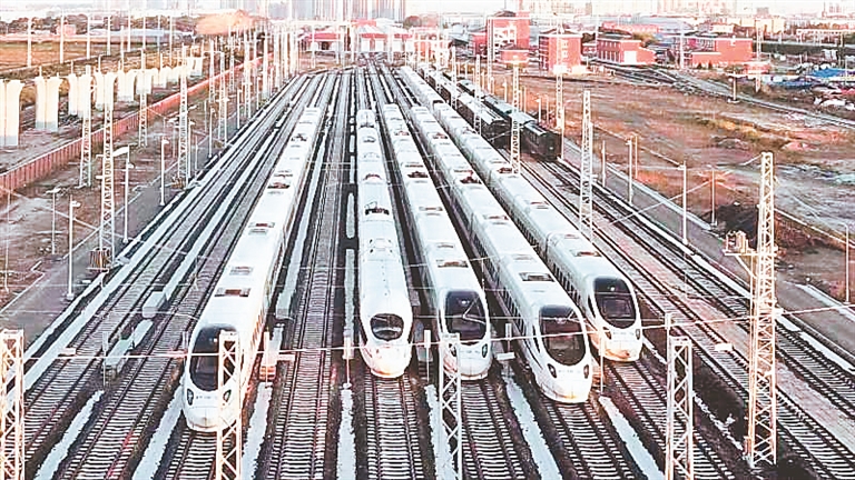 佳木斯高鐵站一列列高鐵動(dòng)車(chē)整裝待發(fā)。