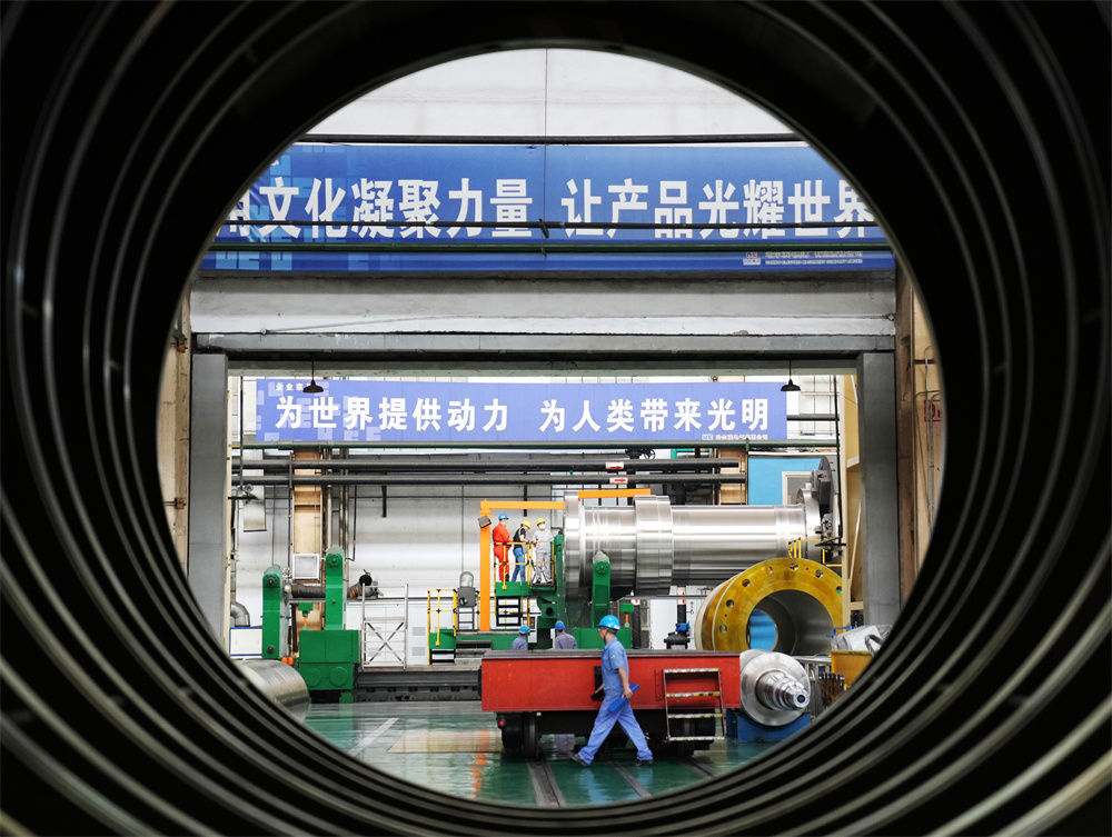 在哈電集團(tuán)哈爾濱電機廠有限責(zé)任公司車間,工人進(jìn)行生產(chǎn)作業(yè)(2022年6月27日攝)。新華社記者 王建威 攝