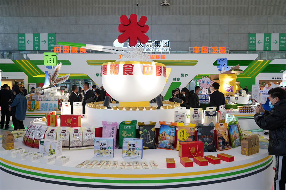 在第三屆中國·黑龍江國際大米節(jié)現(xiàn)場,參觀者在北大荒集團(tuán)展區(qū)了解情況(2020年10月19日攝)。新華社記者 王建威 攝