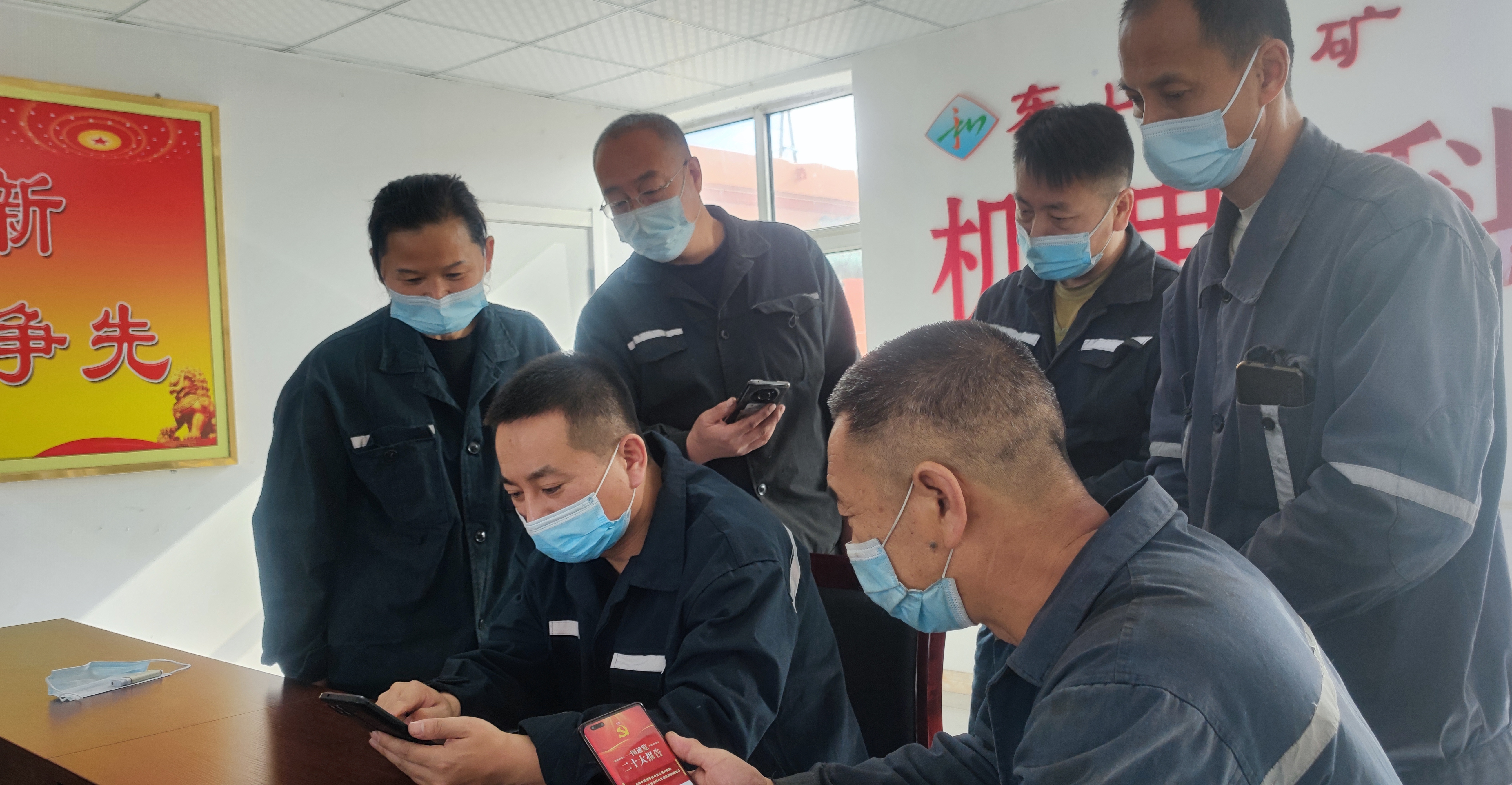 東山礦機電科員工圍坐在一起學(xué)習(xí)討論黨的二十大報告內(nèi)容