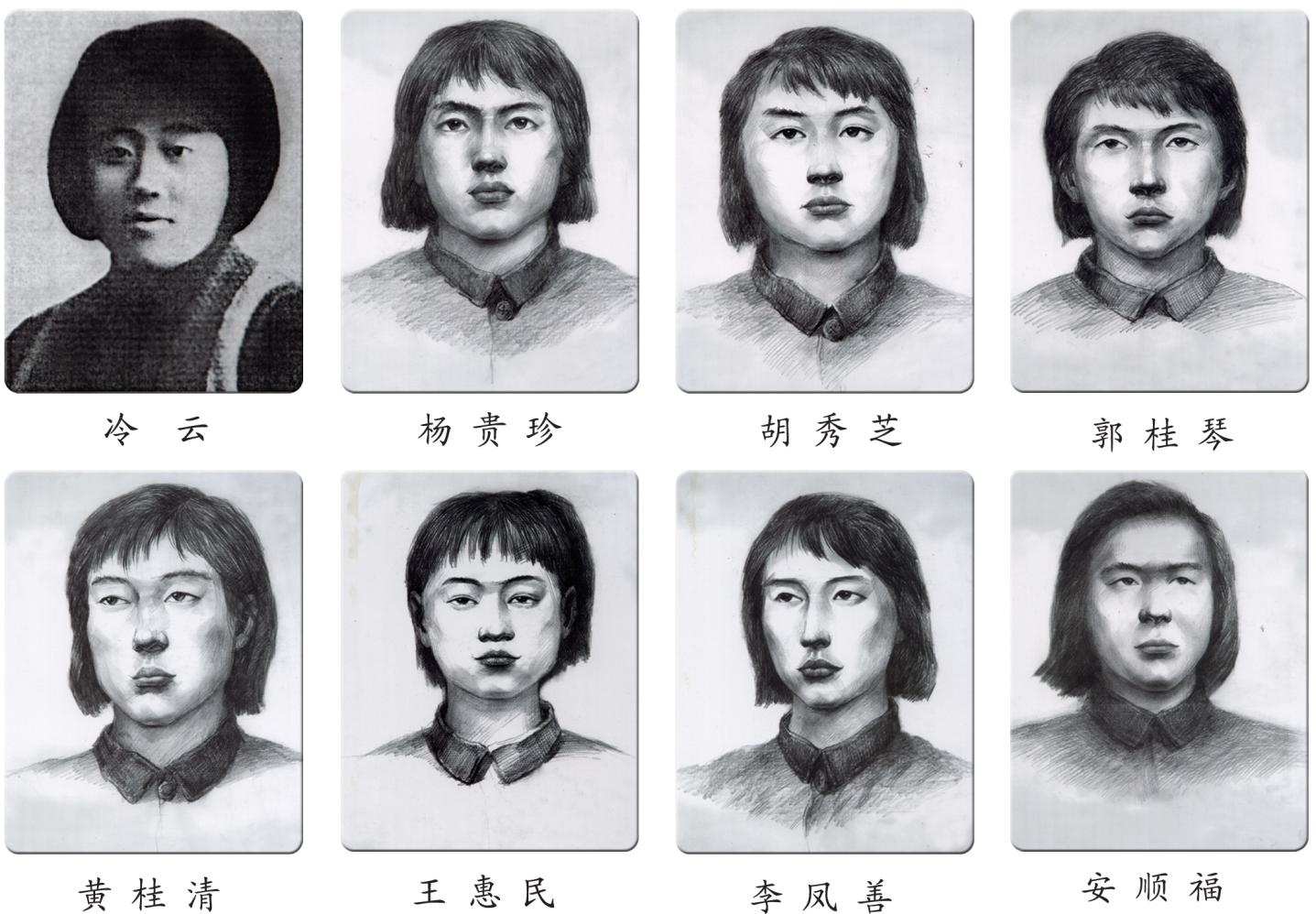 請記?。核齻兪枪伯a(chǎn)黨員、抗聯(lián)二路軍五軍婦女團指導員冷云,共產(chǎn)黨員、五軍婦女團班長楊貴珍、胡秀芝,五軍婦女團戰(zhàn)士郭桂琴、黃桂清、王惠民、李鳳善(朝鮮族)和二路軍第四軍共產(chǎn)黨員、被服廠廠長安順福(朝鮮族)。